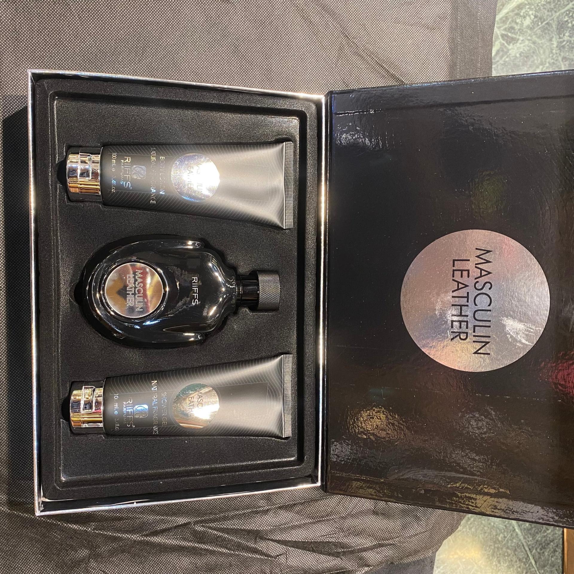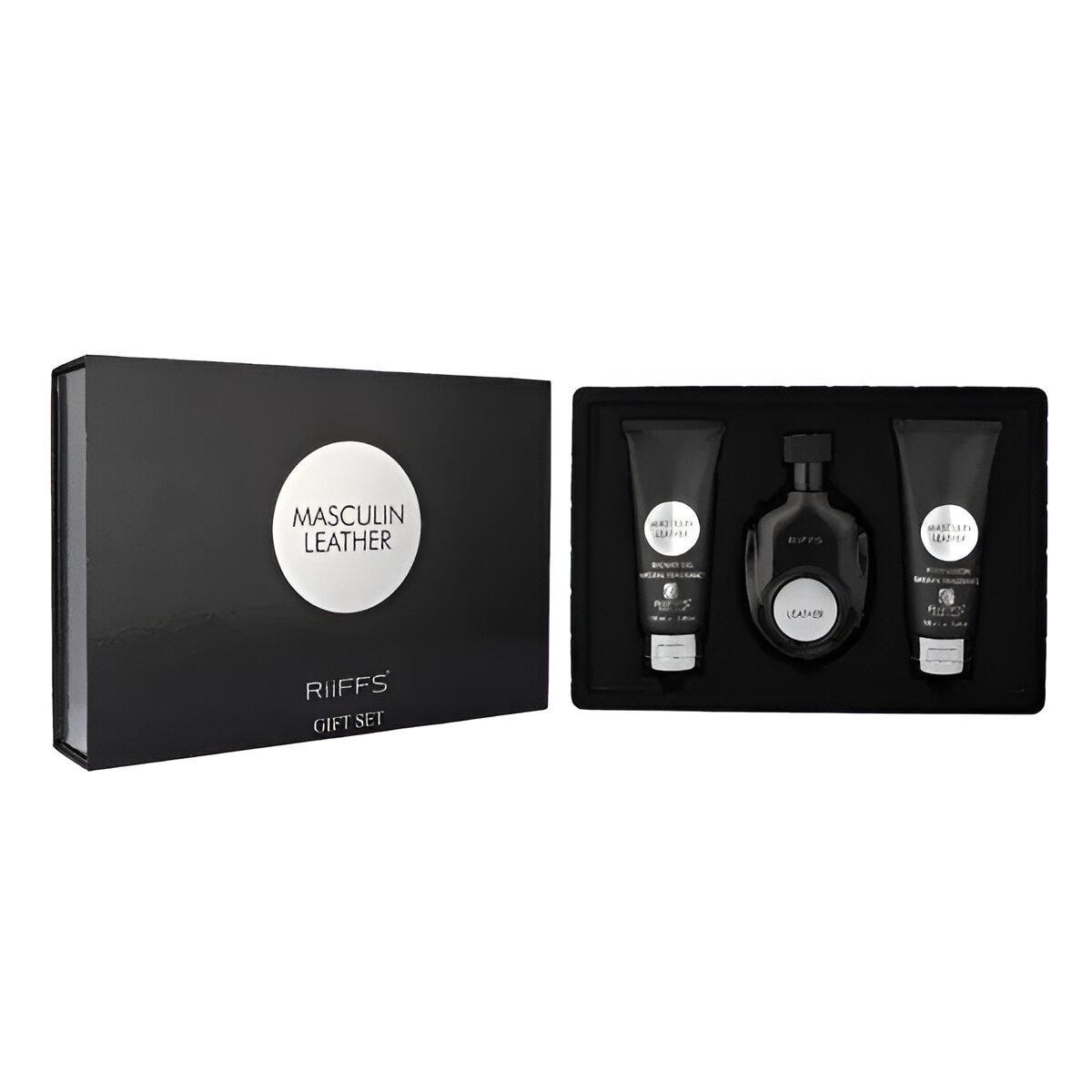 El Set Regalo RIIFFS Leather Giftset 3 piezas Hombre es un estuche completo que combina perfume, gel de ducha y producto post-afeitado o corporal, ofreciendo una experiencia aromática intensa, elegante y duradera. Su fragancia de cuero amaderado lo convierte en una opción ideal como regalo para hombre o como set de cuidado diario para quienes buscan un aroma con carácter y distinción.