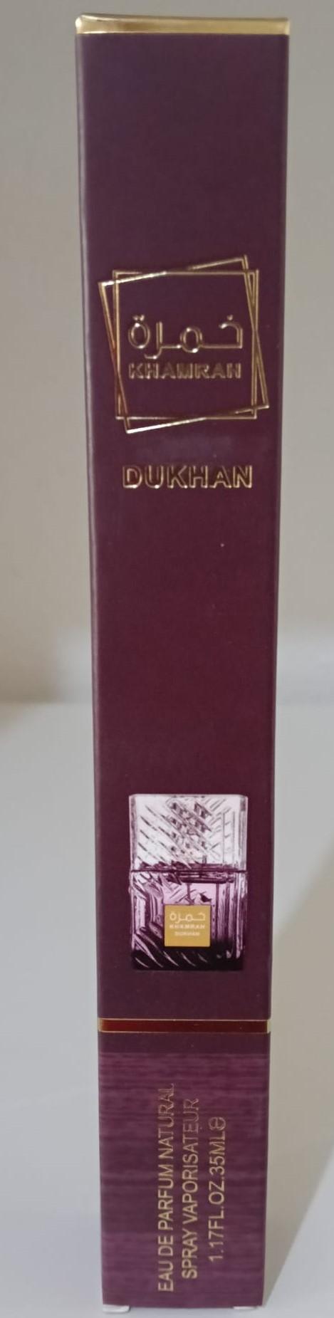 Khamrah Dukhan de Lattafa Perfumes es una fragancia de la familia olfativa Oriental para Hombres. Esta fragrancia es nueva. Khamrah Dukhan se lanzó en 2025. Las Notas de Salida son especias, pimiento morrón y mandarina; las Notas de Corazón son incienso, ládano, flor de azahar del naranjo y pachulí; las Notas de Fondo son tabaco, praliné, ámbar, haba tonka y benjuí.