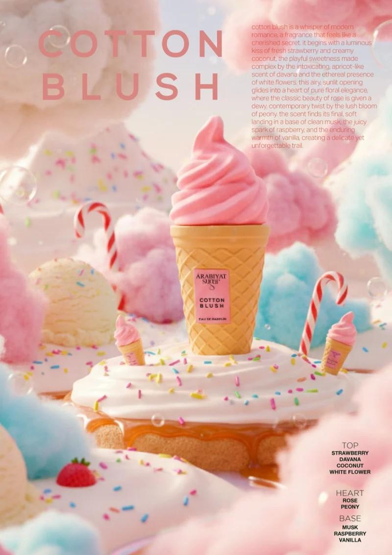 Cotton Blush Arabiyat Sugar es un perfume árabe dulce y afrutado, muy fácil de gustar debido a su encantadora estructura de fresas, frambuesas, coco, peonía, marshmallows y vainilla.