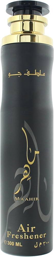 El Air Freshener Maahir 300 ml de Lattafa es un ambientador en spray de origen árabe que perfuma los espacios con una fragancia intensa, elegante y con carácter oriental, inspirada en la reconocida línea Maahir. Está diseñado para neutralizar olores y aportar una estela duradera en hogares, oficinas, vehículos y textiles como cortinas, sofás o alfombras.