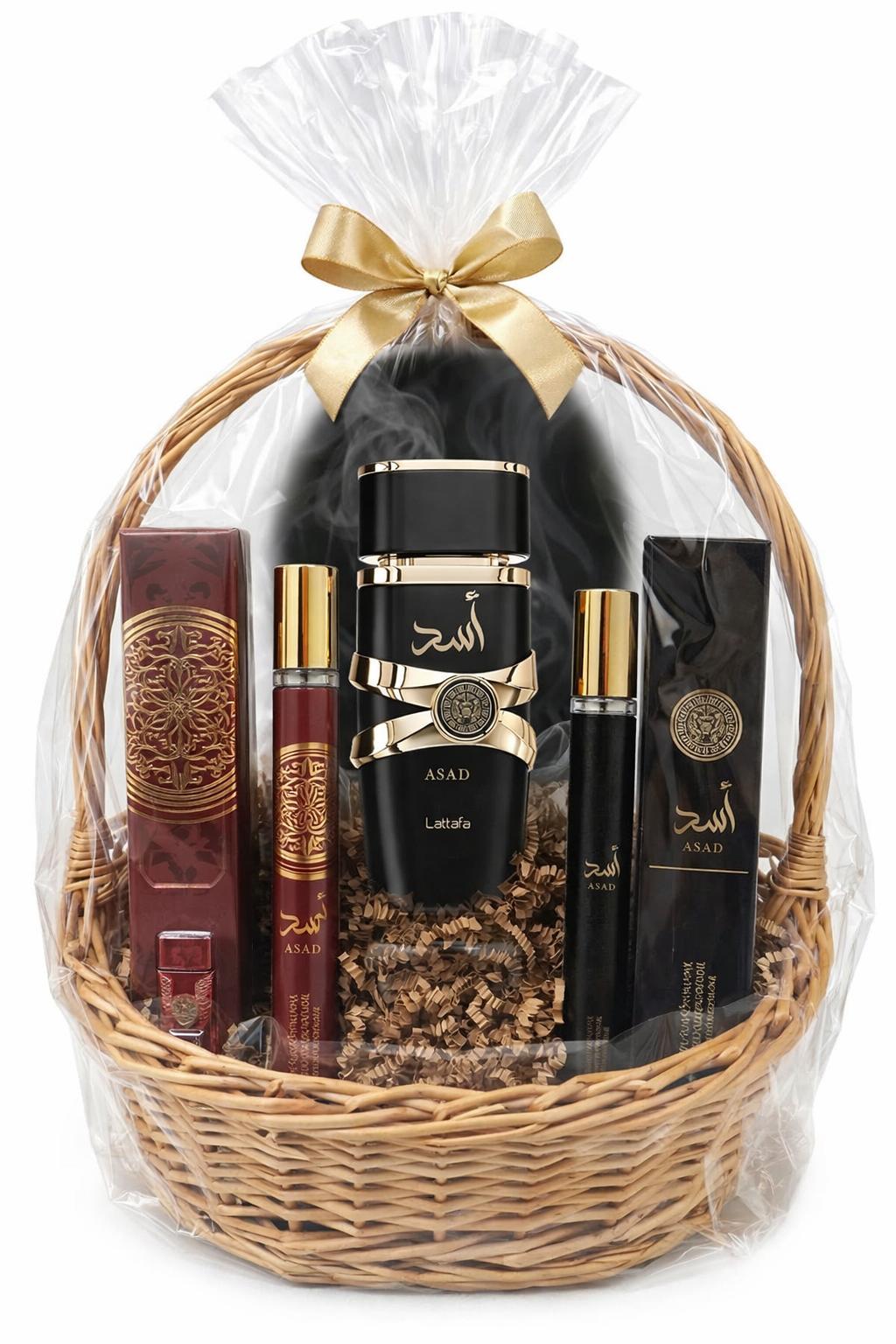 Elegante combo ASAD de Lattafa presentado en una cesta de mimbre con agarradera, cuidadosamente armada y envuelta en papel celofán transparente con lazo decorativo, ideal para obsequio.