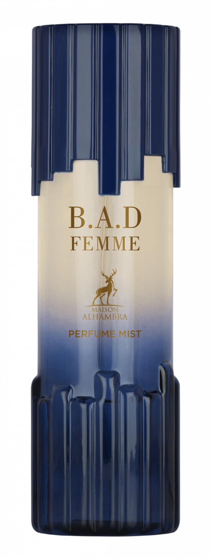 Maison Alhambra B.A.D. Femme Body Mist 250 ml es una bruma corporal perfumada con un aroma floral-ambarado dulce y sofisticado, con notas frescas de bergamota y limón, un corazón floral elegante y una base cálida de vainilla, ambar y cacao que deja una sensación envolvente y femenina sobre la piel.