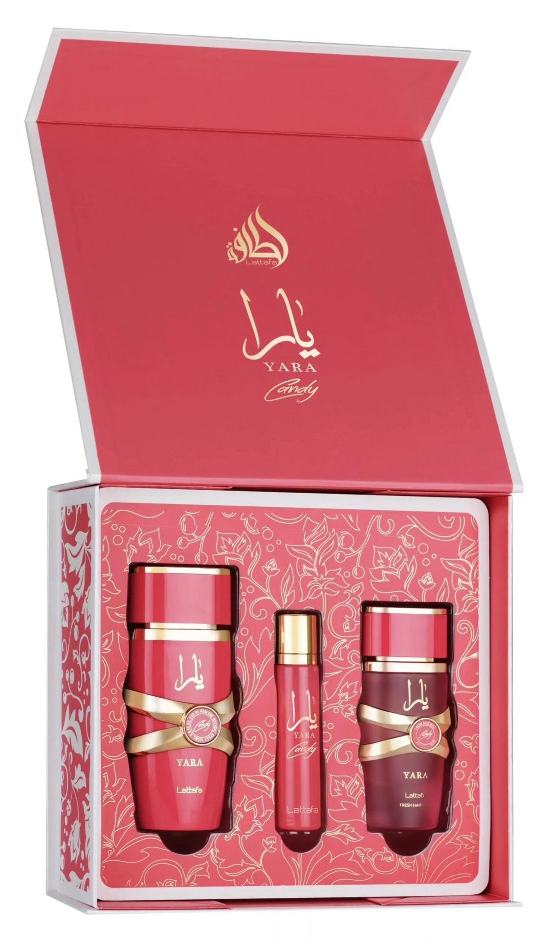 El set incluye el perfume principal Yara Candy Eau de Parfum, acompañado de una versión portátil y una bruma corporal que permite intensificar la fragancia a lo largo del día.