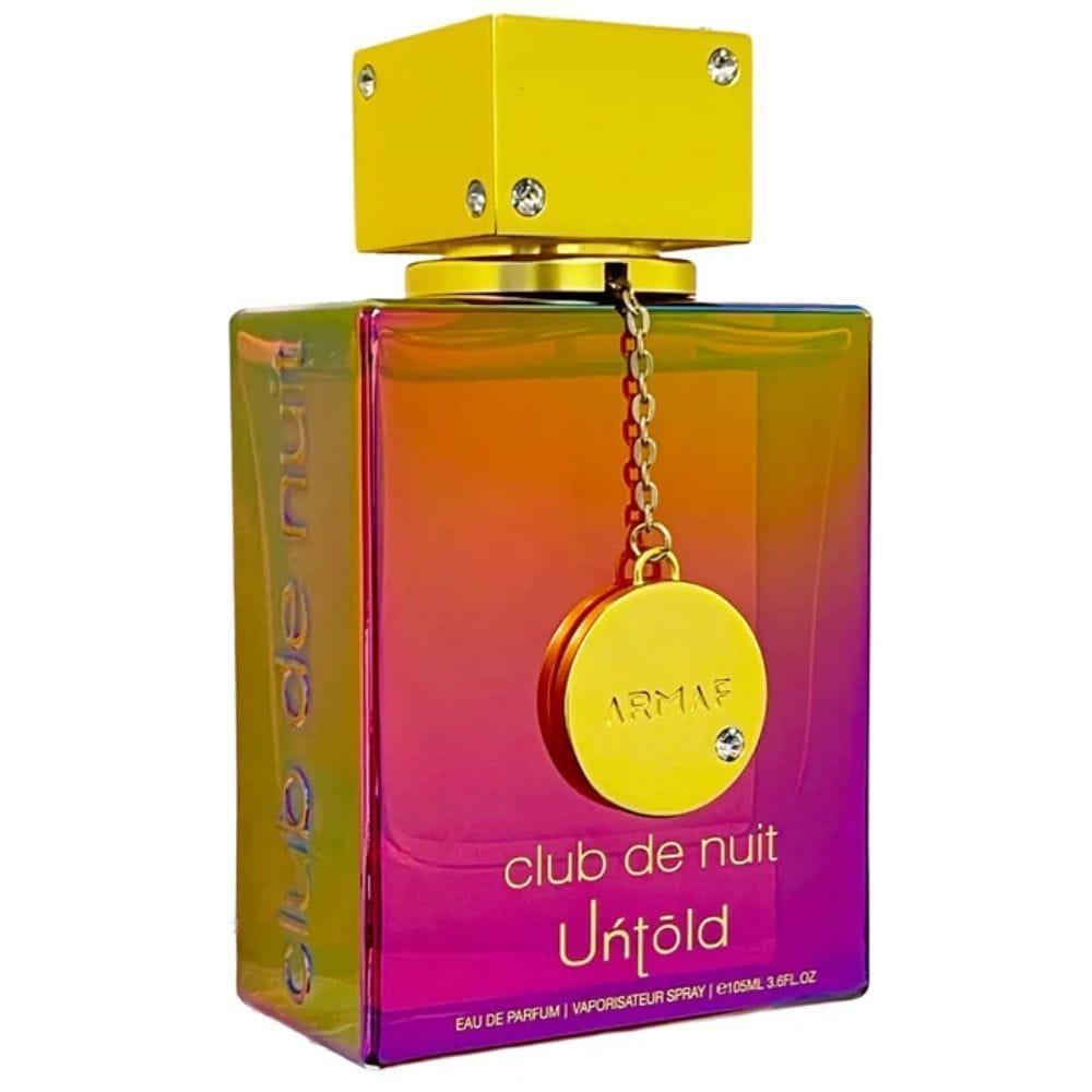 Armaf Club De Nuit Untold es un perfume ambarado, amaderado y especiado. Combina azafrán y jazmín en la salida, un corazón cálido de ámbar y amberwood, y un fondo con notas de cedro y resinas. Es una fragancia elegante, intensa y envolvente.